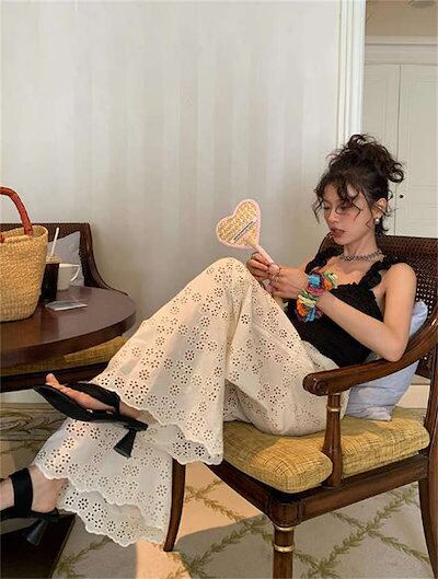 ワイドパンツ レース レディース 夏 パンツ ロング ワイド 総レース ハイウエスト 裏地 フレアパンツ リラックスパンツ ロングパンツ ペチパンツ ボトムス 透け感 ゆったり ウエストゴム カジュア