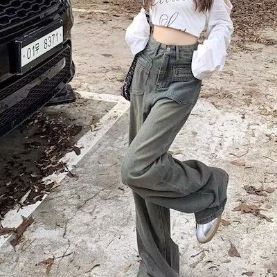 大人気 デニムパンツ 秋 新作 レトロジーンズ女性春秋 ハイウエスト薄型デザインワイドパンツストレートドラッグズボン潮 レディース 脚長効果 美脚効果