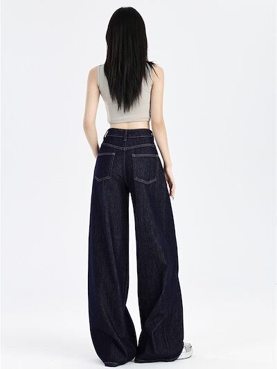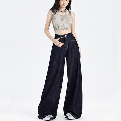 ワイドパンツ アメリカンスタイル ネイビーブルー ジーンズ レディース 夏の秋 薄手 ハイウエスト ゆったり ストレート 薄手 モップ本 美脚 韓国