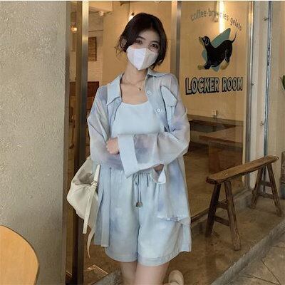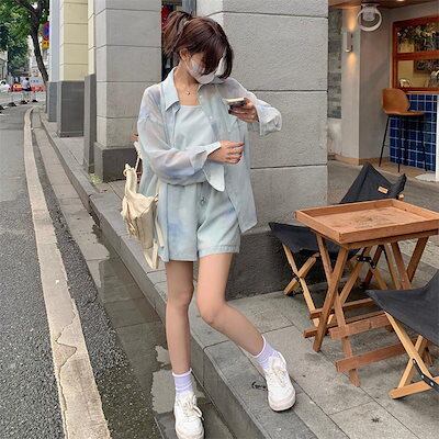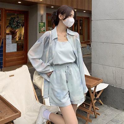 【3日以内出荷】2024 夏 新作 シフォン日焼け止めシャツワイドパンツ3点セット 百掛け 韓国 涼しく楽ちんセットアップ