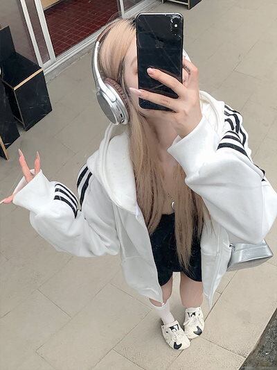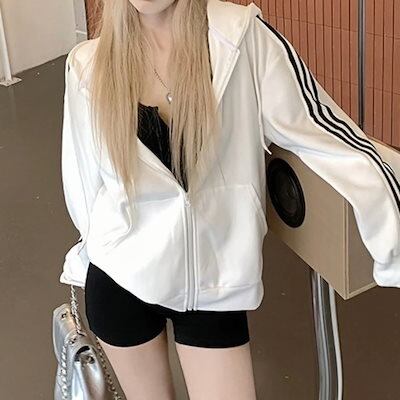 2024 秋トップス パーカー フード付き チャック 長袖 ストライプ ゆったり 細見え 秋 白 黒 おしゃれ かわいい ガーリー キュート 甘め 韓国ファッション レディース お出かけトラック