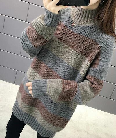 レディース ニット セーター ボーダー柄 ハイネック ざっくり ゆるシルエット 長袖 トップス カジュアル 大人可愛い フェミニン 休日コーデ デート おしゃれ お出かけ デイリー 普段着 グレ