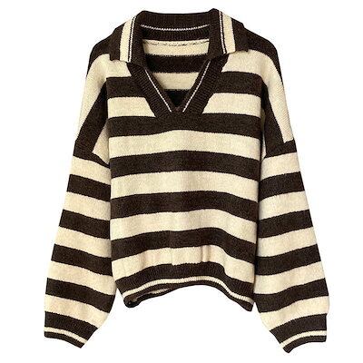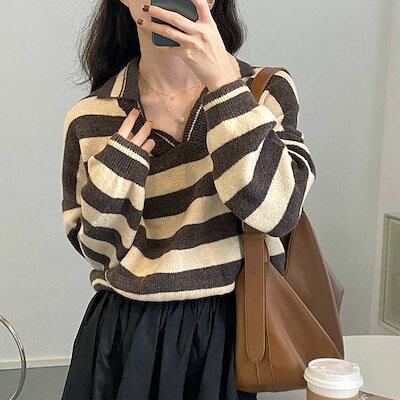 レディース ニット セーター ボーダー柄 襟 Vネック 長袖 トップス カジュアル 大人 可愛い 学生 休日コーデ デート おしゃれ お出かけ デイリー 普段着 ブラウン フリーサイズ