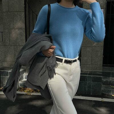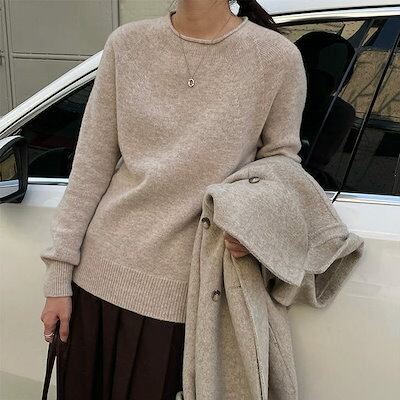 レディース ニット セーター ラウンドネック 長袖 トップス カジュアル 大人可愛い シンプル おしゃれ お出かけ デイリー ライトブルー オートミール ブラック ホワイト オレンジ ピンク ブ
