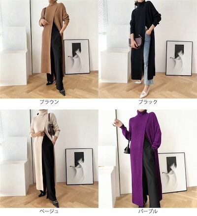 レディース ニット タートルネック ロング丈 セーター 長袖 トップス カジュアル 可愛い キレカジ 休日コーデ 秋冬 お出かけ デイリー 普段着 ブラウン ブラック ベージュ パープル フリー