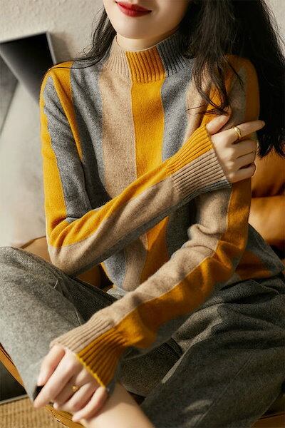 レディース ニット ハイネック ストライプ柄 セーター 長袖 トップス カジュアル キレカジ 大人可愛い きれいめ おしゃれ オフィス ビジネス お出かけ デイリー 普段着 イエロー ブルー M L