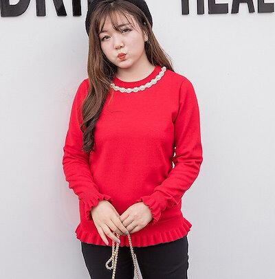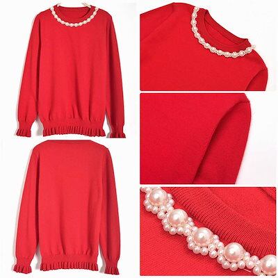 レディース ニット ラウンドネック イミテーションパール セーター 長袖 トップス カジュアル 大人 可愛い フェミニン おしゃれ お出かけ デイリー 普段着 ブラック レッド 2XL 3XL 4XL
