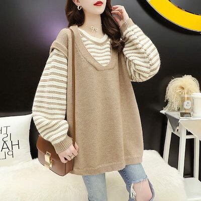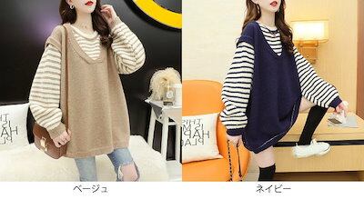 レディース ニット レイヤード風 セーター ボーダー柄 ざっくり ゆるシルエット 長袖 トップス カジュアル 大人可愛い 休日コーデ 学生 おしゃれ お出かけ デイリー 普段着 ベージュ ネイビ