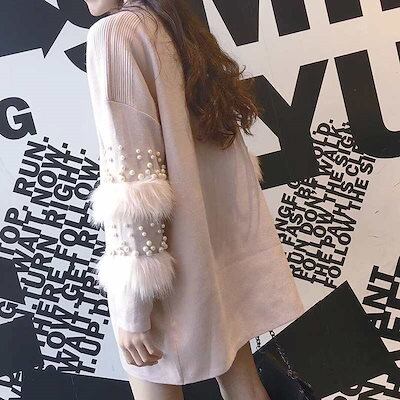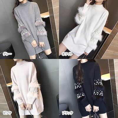 レディース ニット ロング丈 エコファー フェイクファー セーター 長袖 ゆったり プルオーバー トップス 秋 冬 カジュアル 大人 可愛い フェミニン おしゃれ お出かけ デイリー グレー ホワ