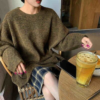 レディース ニット ロング丈 ゆるシルエット カットソー 長袖 シンプル セーター トップス カジュアル 大人 可愛い フェミニン おしゃれ お出かけ デイリー 普段着 グレー ブラウン フリー