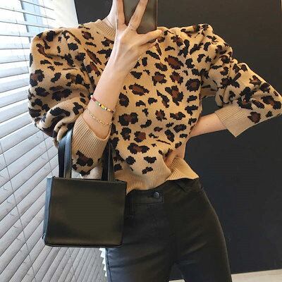 レディース ヒョウ柄 ニット ショート丈 セーター タイト 長袖 トップス カジュアル クール 大人かっこいい セレカジ 休日コーデ おしゃれ お出かけ デイリー 普段着 ブラウン グレー フリー