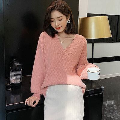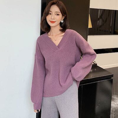 レディース リブニット Vネック セーター 長袖 カットソー トップス カジュアル 大人 可愛い フェミニン おしゃれ お出かけ デイリー 普段着 グリーン パープル ピンク ベージュ フリーサイ