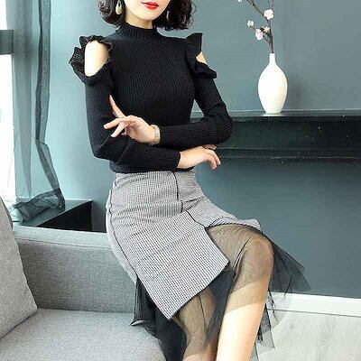 レディース リブニット セーター ハイネック ショルダーカット タイト フィット スリム 長袖 トップス カジュアル 大人 可愛い フェミニン おしゃれ お出かけ デイリー 普段着 ブラック S M