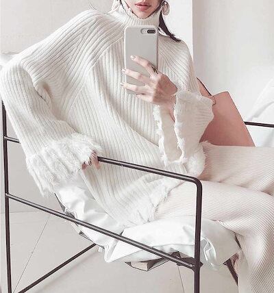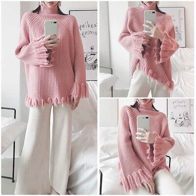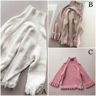 レディース リブニット セーター 長袖 フレアスリーブ ハイネック オーバーサイズ ゆったり プルオーバー トップス 秋 冬 カジュアル 大人 可愛い フェミニン おしゃれ お出かけ ベージュ