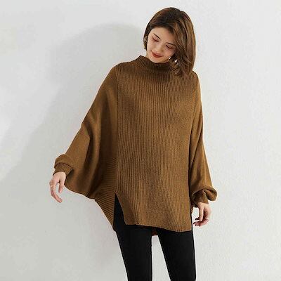 レディース リブニット ポンチョ ハイネック スリット セーター 長袖 トップス カジュアル 大人カジュアル 大人可愛い クール おしゃれ お出かけ デイリー 普段着 ベージュ ブラウン フリー