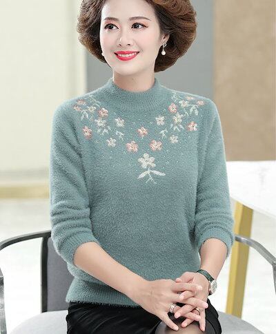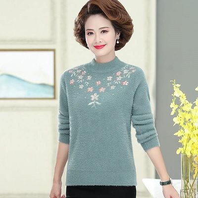 レディース 婦人服 トップス ハイネック プルオーバー フリースセーター リブ編み袖 ビーズ飾り 長袖 花柄 カジュアル 大人ファッション きれいめ キレカジ おしゃれ お出かけ デイリー 普段着 オ