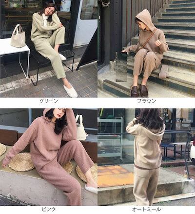 レディース 上下2点セット ニット + クロップドパンツ パーカー 長袖 カジュアル 可愛い きれいめ エレガント 無地 リラクシー おしゃれ お出かけ お呼ばれ グリーン ブラウン ピンク オー