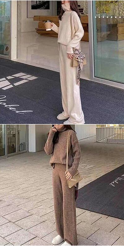 タートル セットアップ レディース ニット 秋冬 パンツセット ワイドパンツ ニット 2点セット 長袖 せーたー タートルネック トップス カジュアル ロングパンツ 着痩せ 体型カバー きれいめ ゆっ