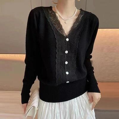ニット 長袖 vネック レース切り替え レディース 透け感 花柄 おしゃれ Vネック 重ね着 長袖トップス ニット プルオーバー キレイめ カジュアル おしゃれ Tシャツ ホワイトブラック 白 韓国
