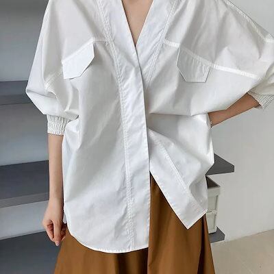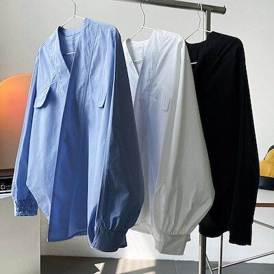 ロンT韓国ファッションシアーシャツ 2024 秋新作 長袖トップス レディース シアーシャツ シャツ ノーカラーブラウス 長袖 ポケット Vネック 袖ゴム 襟なし 大人可愛い