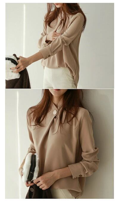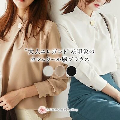 送料無料&即納 ネック ボタン カシュクール ブラウス 長袖 上品 エレガント 無地 抜き襟 フォーマル / レディース トップス シャツ とろみ オフィス オフィスカジュアル 清楚 パーティー 大