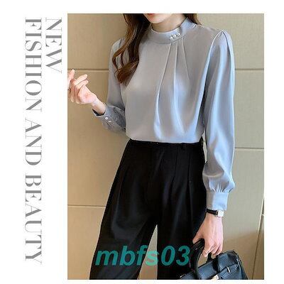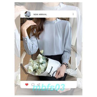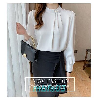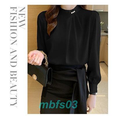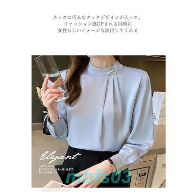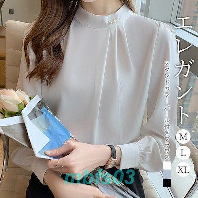 ブラウス レディース 長袖 シャツ スタンドカラー 立ち襟 通勤 ビジネス フォーマル タック パール付き ファッション