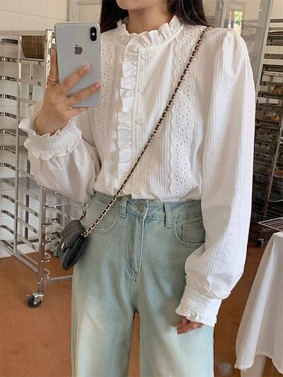 ブラウス レディース 長袖 シャツブラウス 襟フリル シャツ レース 白ブラウス 綿混 トップス 無地 前開き スーツインナー お洒落 可愛い カジュアル オフィス 無地 シンプル ゆったり 定番 エ