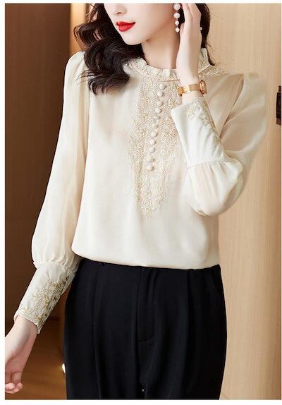 フリル襟ブラウス 光沢感 レディース 長袖 刺?ブラウス シフォン 花柄刺? 華やか トップス スーツインナー フリル襟 通勤 オフィス 仕事 OL おしゃれ 大人可愛い ゆったり カジュアル フォー