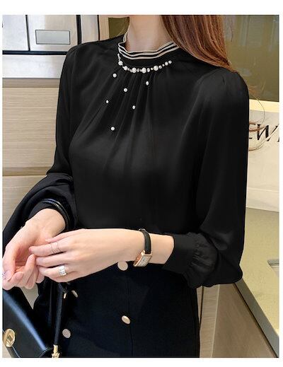 パール付き ブラウス 立ち襟ブラウス レディース シフォン プルオーバー ブラウス フロントタック 通勤 トップス 長袖 オフィス 仕事 事務所 ベーシック スーツインナー フェミニン エレガント 春