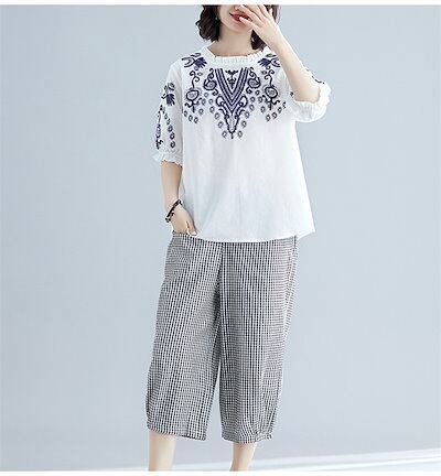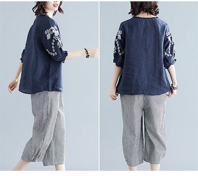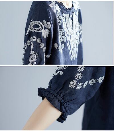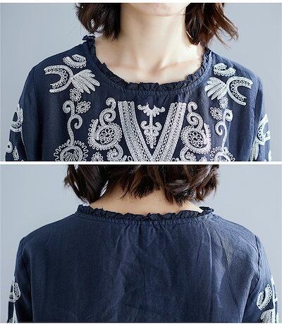 ブラウス 花柄刺? ブラウス 夏 Tシャツ レディース 半袖 綿麻風ブラウス トップス フリル襟 プルオーバー 花柄刺? 森ガール カットソー エスニック 大きいサイズ ゆったり 爽やか ナチュラル