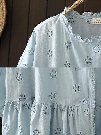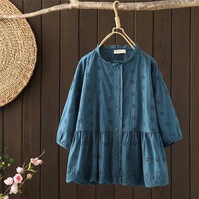 コットンレースブラウス ボリューム袖 チュニックブラウス レディース 夏 五分袖 ブラウス 刺?花柄 レース フリル襟ブラウス トップス 立ち襟シャツ 綿混 森ガール キレイめ カジュアル 大人可愛