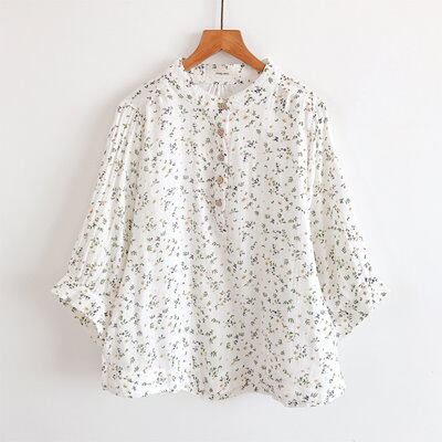 コットン シャツ ブラウス レディース 綿 小花柄 シャツ バンドカラー プルオーバー 立ち襟ブラウス 七分袖 カットソー 春 夏 森ガール カジュアル トップス シンプル ナチュラル 大人可愛い ゆ
