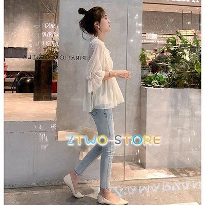 ペプラムトップス ブラウス レディース 五分袖 七分袖 キャンディスリーブ Vネック 立ち襟 フリル 裾フリル 大きいサイズ シアー袖 韓国 ファッション Aライン