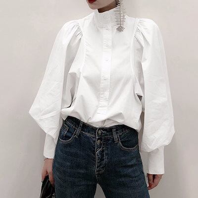 新作 日系 立ち襟 ランタン袖シャツ ゆったり 無地 ブラウス 気質 着痩せ ワイシャツ 長袖 レディース トップス