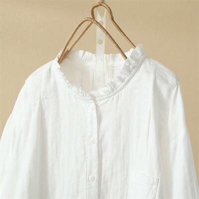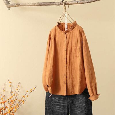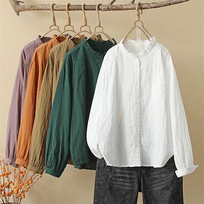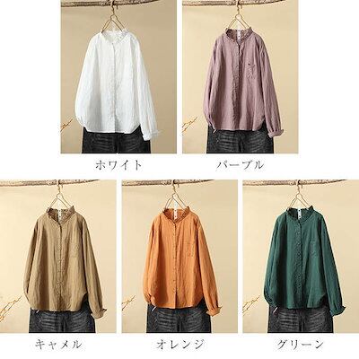 シャツ レディース 長袖 立ち襟 お洒落 ダブルガーゼ ブラウス 綿100% 前開き オフィス ブラウス 春 トップス 大人 カジュアル シンプル 体型カバー 大きいサイズ ゆったり ホワイト パーブ