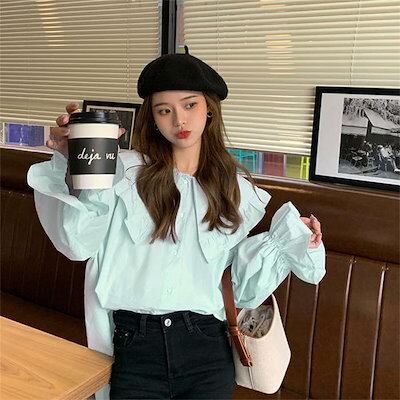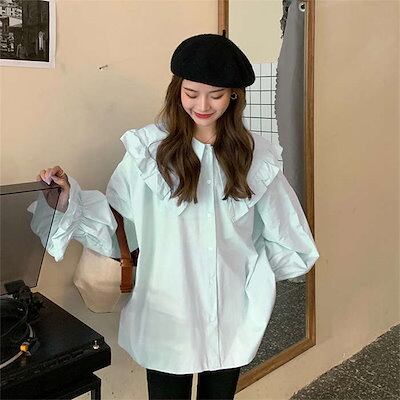 シャツブラウス 長袖ブラウス レディース トップス ビッグ襟 ビッグカラー シャツ フリル ボリュームスリーブ ブラウス おしゃれ 長袖 春 秋 無地 フリル ガーリー かわいい カジュアル お洒落
