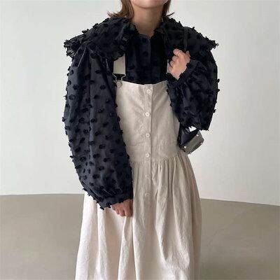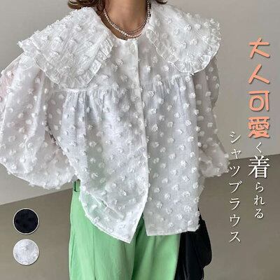 ブラウス レディース トップス シャツ ビックカラー セーラーカラー フリル 襟付き 袖あり 長袖 ボリューム袖 デザインカラー 衿 折り襟 前開き 透かし感 きれいめ 二の腕カバー ゆったり ラフ