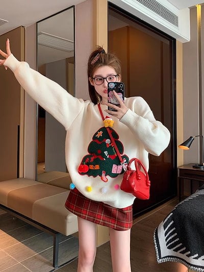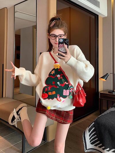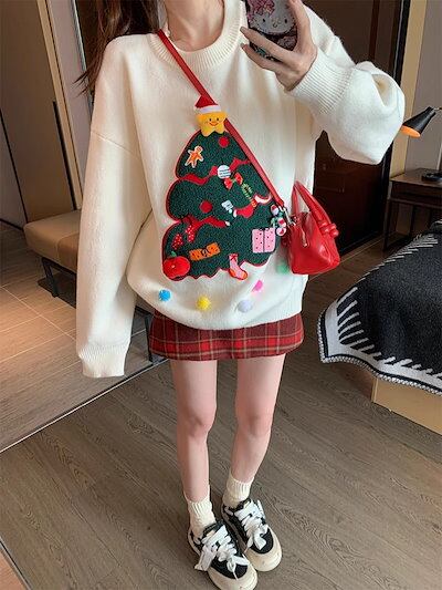 秋 冬 レディースファッション ベーシックニット ラウンドネック ゆったり スノーフレーク エルク イベント シンプルデザイン ニットトップス ニットセーター ニット長袖