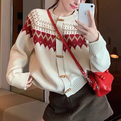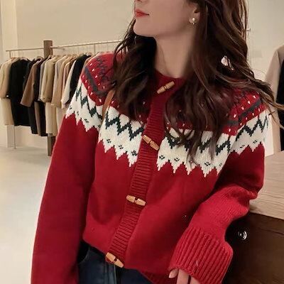 秋 冬 レディースファッション ベーシックニット クリスマス レトロヒットカラージャンパーコート女性 木製カウルボタン 赤 ニットトップス ニットセーター ニット長袖