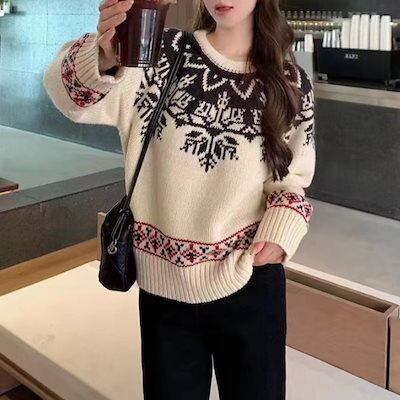 秋 冬 レディースファッション ベーシックニット ジャカードジャンパーの怠惰な風のラウンドネック汎用性の高い 女性の新しいレトロクリスマス シニア感覚 ニットトップス ニットセーター ニット長袖