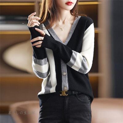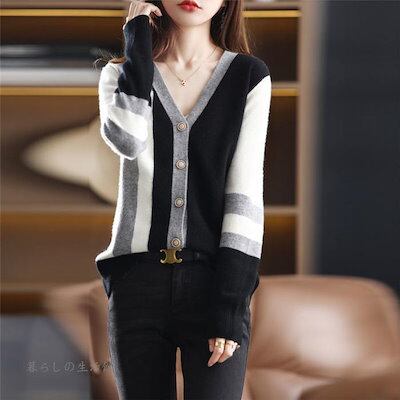 ニットカーディガン レディース 秋冬 40代 長袖 ニットトップス 配色コーディガン vネックカーディガン セーター ゆったりアウター おしゃれ 韓国風 50代 30代