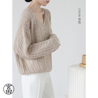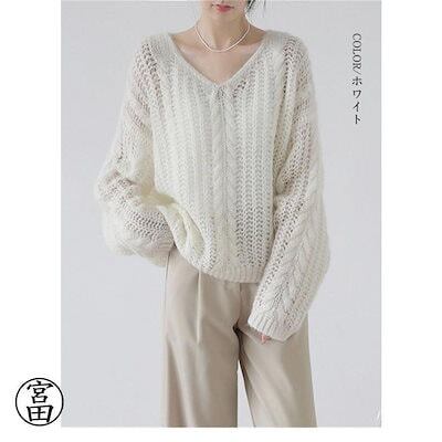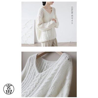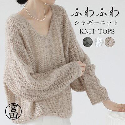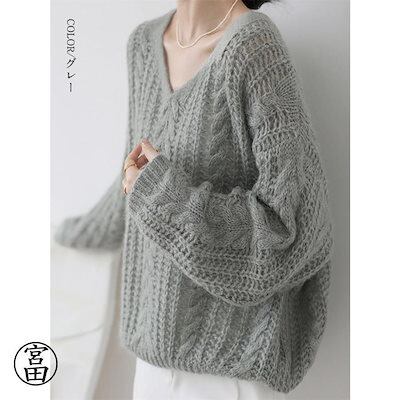 新品(タイムセール)シャギーニット トップス レディース メッシュ ニット 長袖 秋冬 透かし編み ドルマン ドロップショルダー Vネック ケーブル編み セーター プルオーバー レイ