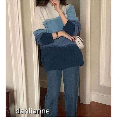 グラデーションカラー セーター レディース 秋 冬 ゆったり ニットセーター きれいめ ニット 長袖 ラウンドネック レトロ トップス 配色 プルオーバー