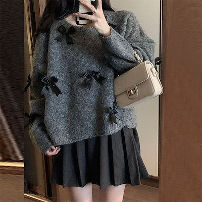 グレー リボン 長袖ニット 韓国 ゆったり カジュアル セーター プルオーバー 秋冬新作 レディース ニットトップス カットソー