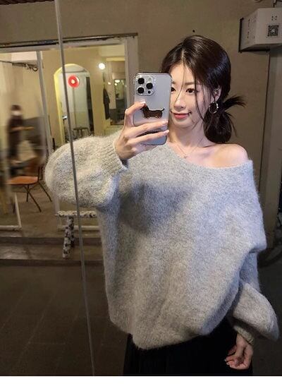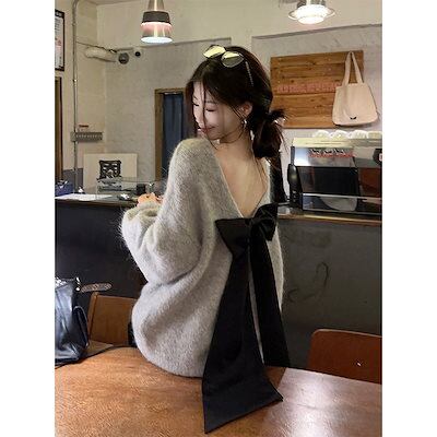 2024秋冬2カラー ニット バックコンシャス バックリボン オープンバック バックレス ルーズ 長袖 レトロ 韓国ファッション レディース