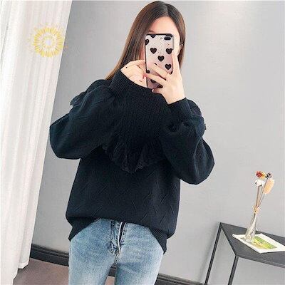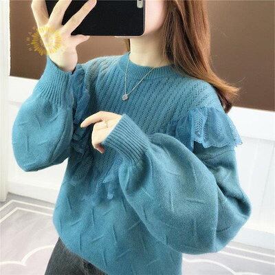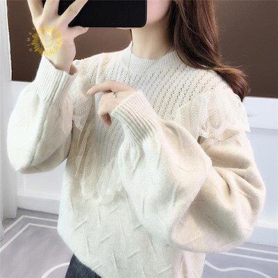 【beifengzh 0 ng】新作ニット セーター レディース ニットセーター 長袖 トップス レースフリル チュニック 大きいサイズ 体型カバー 秋 冬 定番 もこもこ コーデ 防寒 可愛い