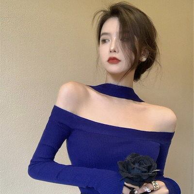 ブラウス首かけニットレディース秋冬新作韓国版ワンショルダーセクシーギャルタイツタイトスリムショート丈トップスラブリータートルネックラウンドネックニットあったか!カシミヤタッチロンT
