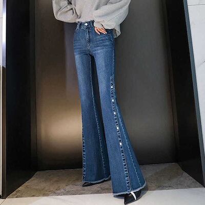 フレアパンツ ストレッチ スキニーデニム レディース デニム ロングパンツ スリット入り ロングフレアパンツ デニムフレアパンツ 秋 冬 ハイウエスト ロングデニムパンツ 無地 シンプル カジュアル