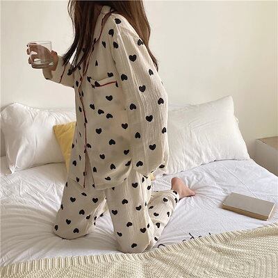 ルームウェア ジャージ ペアルック カップル韓国ins婦人服コットンガーゼパジャマ春と秋の長袖カーディガン愛の部屋着セットセットアップ レディーススウェット上下セット