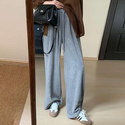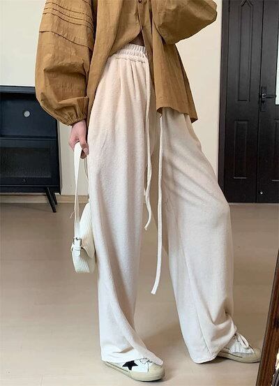 冬 秋冬 ゆったり ロング丈 着?せ ワイドパンツ 無地 春 ギャザー ストレートパンツ ズボン ニットパンツ 暖かい ボトムス シンプル ウエストゴム ポケット付 ロングパンツ レディース コットン
